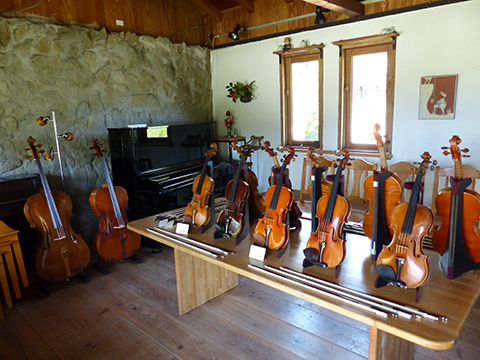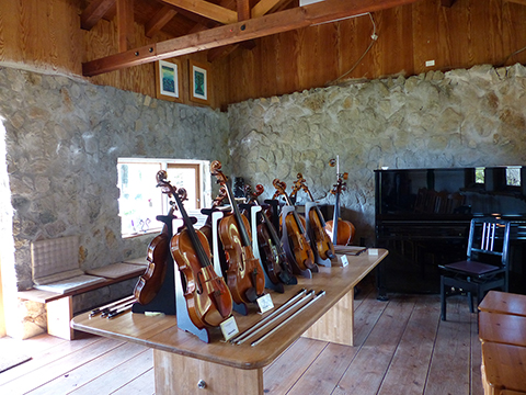 ロッジ風の建物の小ホールでバイオリン4本、ビオラ2本、チェロ3本と厳選された弓数本が展示されていました。
