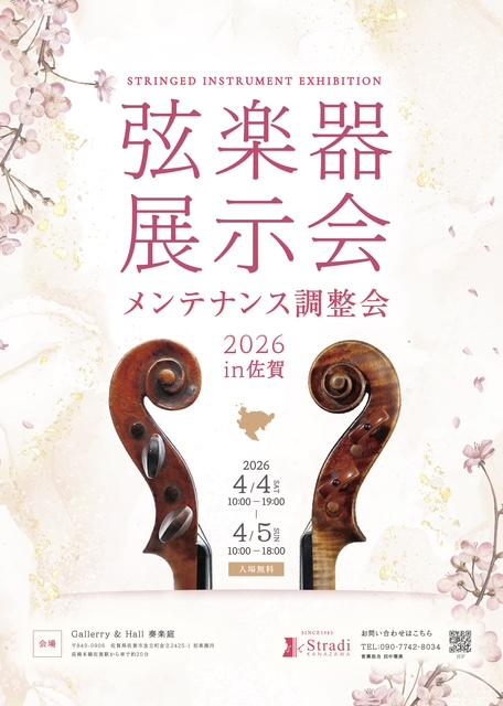 2026年4月4日(土)・5日(日)の2日間、 佐賀県佐賀市にて「弦楽器展示会・メンテナンス調整会」 を開催いたします。