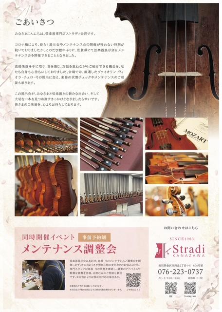 当日は、厳選した弦楽器の展示・ご試奏 に加え、 メンテナンス・調整会(事前予約制) も同時開催いたします。