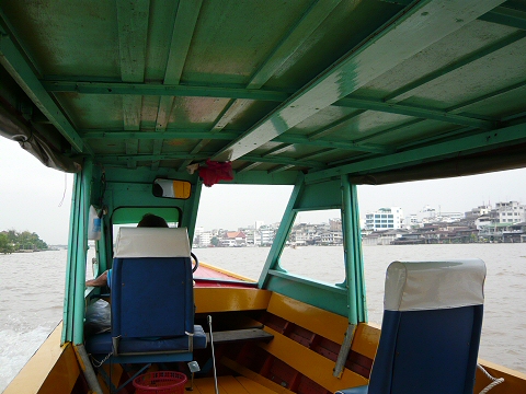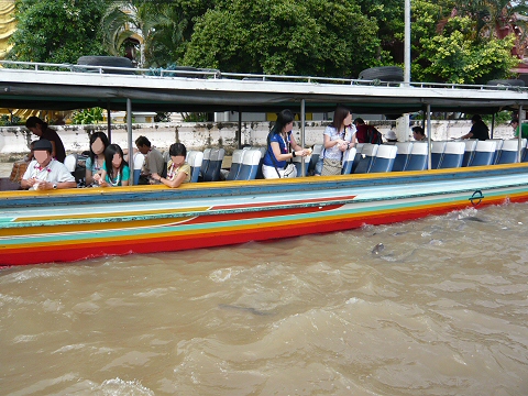 再びチャオプラヤ川の遊覧船に乗り対岸へ。水の色は茶色く濁っています。川の中に大きな魚がいるようです。