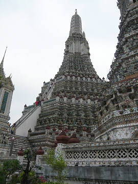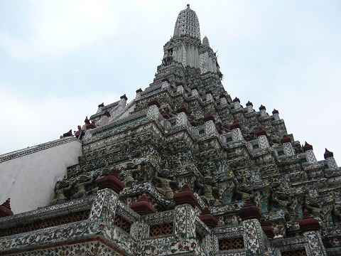 ワット・アルンの大仏塔(高さ75m、台座の周囲は234m)は19世紀のラーマ2世が建設を開始し、ラーマ3世の時代に完成。表面には色鮮やかな中国製の陶器がはめ込まれ、中国美術の影響を強く受けています。仏塔の頭頂部は、バラモン教のシバ神の象徴であるリンガ(男性器の象徴)の形となっているそうです。大仏塔の周りには4基の小仏塔が立っていて須弥山を表現しているそうです。