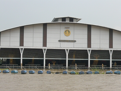 チャオプラヤ川の西岸(王宮の対岸側)にある博物館です。王室の記念式典の際に行われる御座船8隻が格納、展示されているそうです。チャオプラヤ川の遊覧船から、展示されている御座船の船首部分が見えました。■王室御座船博物館1