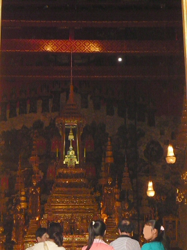 本堂には、本尊エメラルド仏が安置されています。この像は紀元前に北インドで作られ、幾多の王朝の戦いに巻き込まれ数奇な運命をたどってワット・プラケオにきたもので、タイで一番重要な仏像とされています。