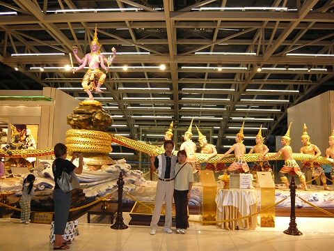 バンコク・スワンナプーム国際空港。スワンナプーム国際空港はバンコク市街地より30kmに位置する新空港です。空港内のコンコースにはナーガ(蛇神)の像らしきものが置かれていて、記念撮影のスポットになっていました。