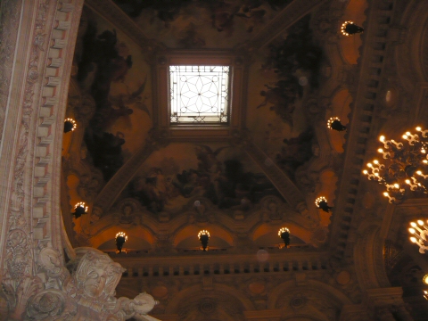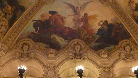 Eugene Lenepveu)が描いたもの。ホール内照明に使われていたガス灯の影響で劣化が進行してしまい、その対策として、修復ではなくシャガールによる描き変えが選択されました。これについては現地で賛否両論がいまだにあるそうです。※許可を得て撮影。