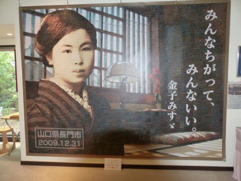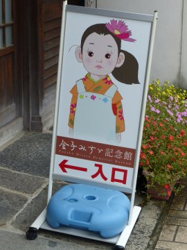 1:金子みすゞ記念館。金子みすゞ(1903-1930、かねこ・みすず。本名:金子テル)は大正時代末期から昭和初期にかけて活躍した童謡詩人です。20歳頃より童謡を書き始め、26歳で夭折するまでに512編の詩を綴ったとされます。西条八十(1892-1970、さいじょう・やそ)から「若き童謡詩人の中の巨星」と賞賛されるなど、めざましい活躍をみせました。しかし、私生活には恵まれず、悩み苦しんだ挙句に自殺してしまいました。その後、彼女の作品は散逸してしまい、幻の童謡詩人として歴史に埋もれてしまいました。